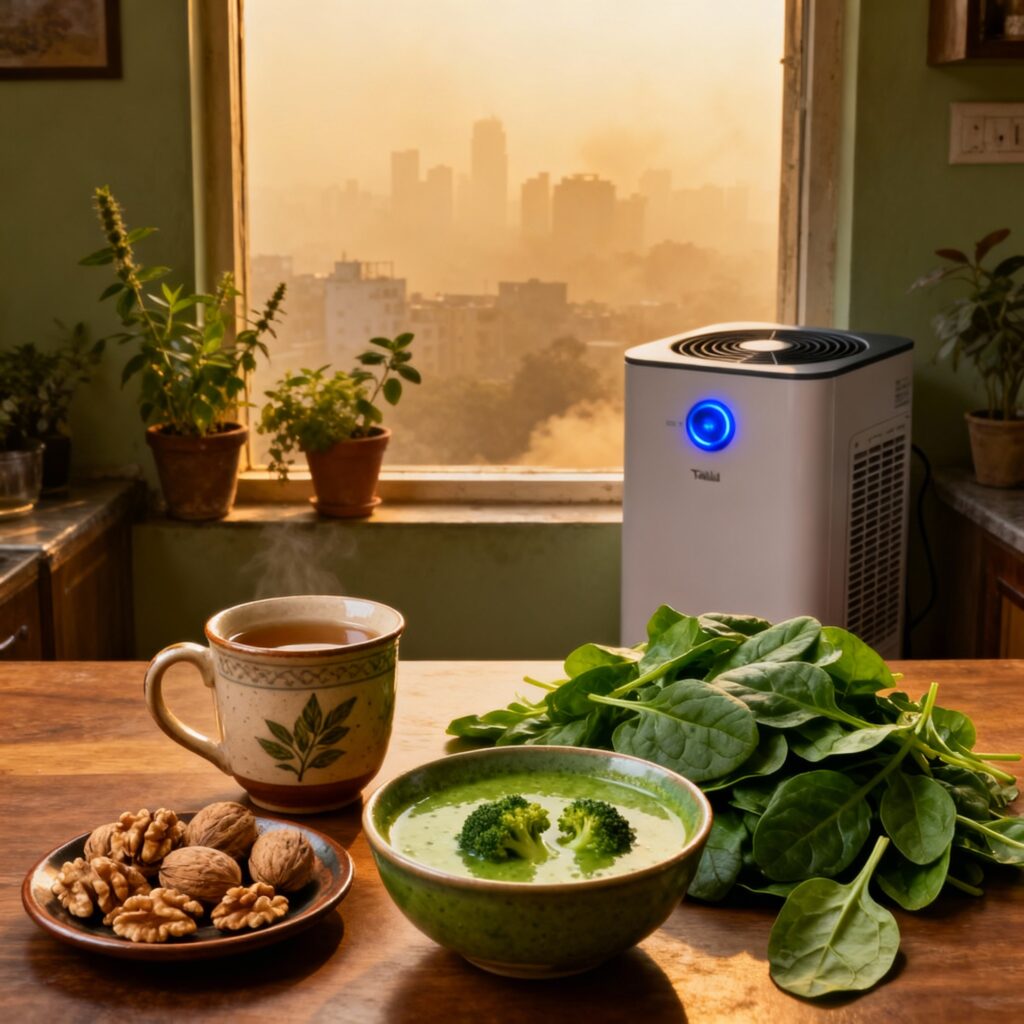 दीवाली के बाद और सर्दियों में बढ़ते प्रदूषण के असर से बचना चाहते हैं? जानिए कौन-सी खाने की चीजें, हर्बल ड्रिंक्स और आसान घरेलू रूटीन आपके फेफड़ों व इम्यूनिटी को मजबूत बनाते हैं। पालक, ब्रोकली, तुलसी, गुड़ व योगिक अभ्यास आपकी रोज़ की डाइट में शामिल करें – और खुद को हर दिन स्वस्थ रखें!