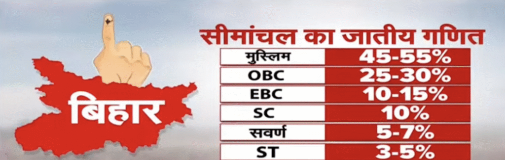 सीमांचल के इलाके में किशनगंज, अररिया, पूर्णिया और कटिहार जैसे जिले आते हैं, जहाँ मुस्लिम आबादी 40% से 68% तक है। 2020 के विधानसभा चुनाव में, AIMIM ने इसी क्षेत्र की पाँच विधानसभा सीटें जीतकर सबको चौंका दिया था। यह पहली बार था जब मुस्लिम वोट MY समीकरण से अलग होकर किसी अन्य पार्टी की तरफ गया।
